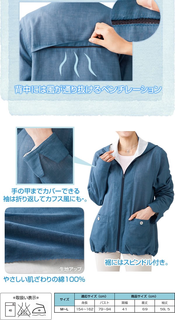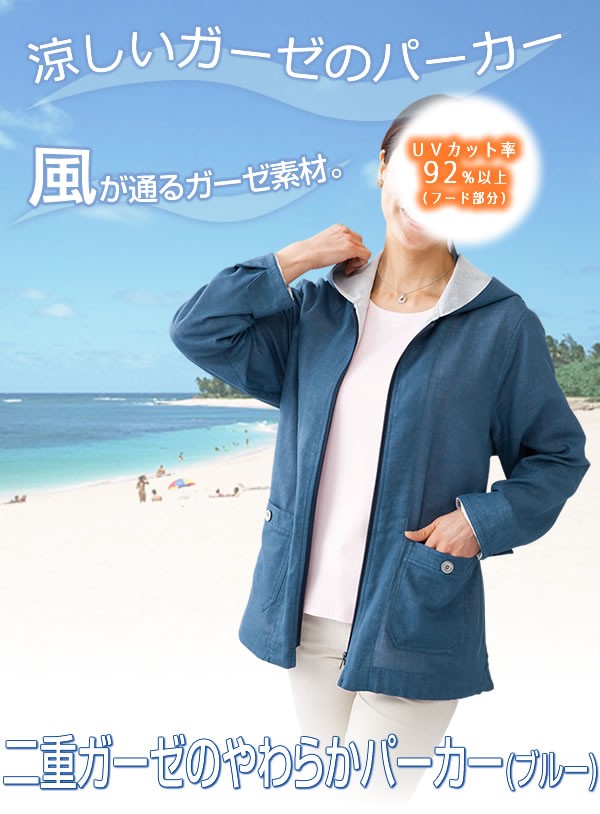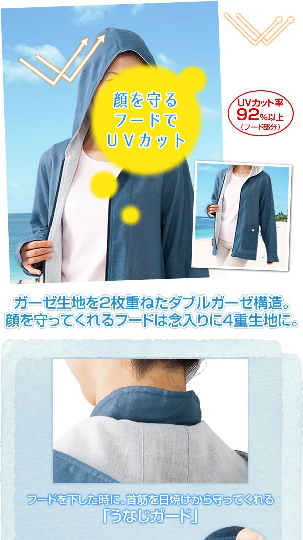 | <h1>涼しいガーゼのパーカー。やさしい肌ざわりの綿100%二重ガーゼ素材。顔を守ってくれるフードは念入りに4重構造にしUV対策。フードを下した時に首すじを日焼けから守るうなじガード、背中には風が通り抜けるベンチレーションがついています。</h1> |