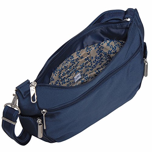 Fabric/Polyester Main compartment has RFID blocking card and passport slots