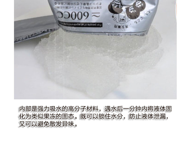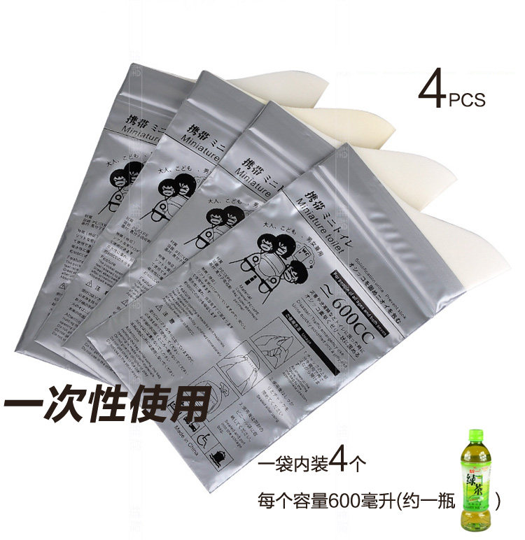 ■ 本产品是一种便捷式随身携带应急用微型马桶,包括柔性的袋体,袋体的外表采用环保型抗拉力不透水PE材料,PE材料内衬环保吸水性强的粗纹无妨布,表层+内衬起到按压定型作用,袋体内部两侧及底部分别有两个夹层,一体型设计,夹棉内夹层中分别装有超强吸收固化剂和杀菌剂。能迅速吸收尿液并变为胶状物质,避免尿液外溢, 不产生异味。