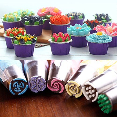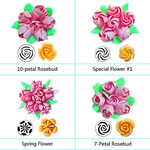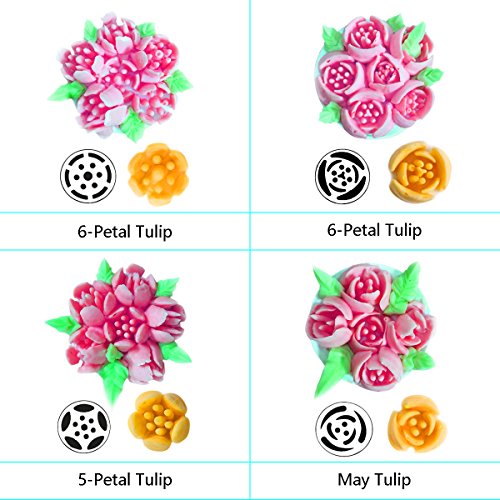- Easily Mastered: Within the package, you will find a colorful sheet that tells what flower each icing tips produces, along with buttercream icing recipes and tutorial video guidance sent after order; follow the instructions you will create amazing beautifully designed buttercream flowers and cupcake bouquets easily with those easy handle piping tips.
