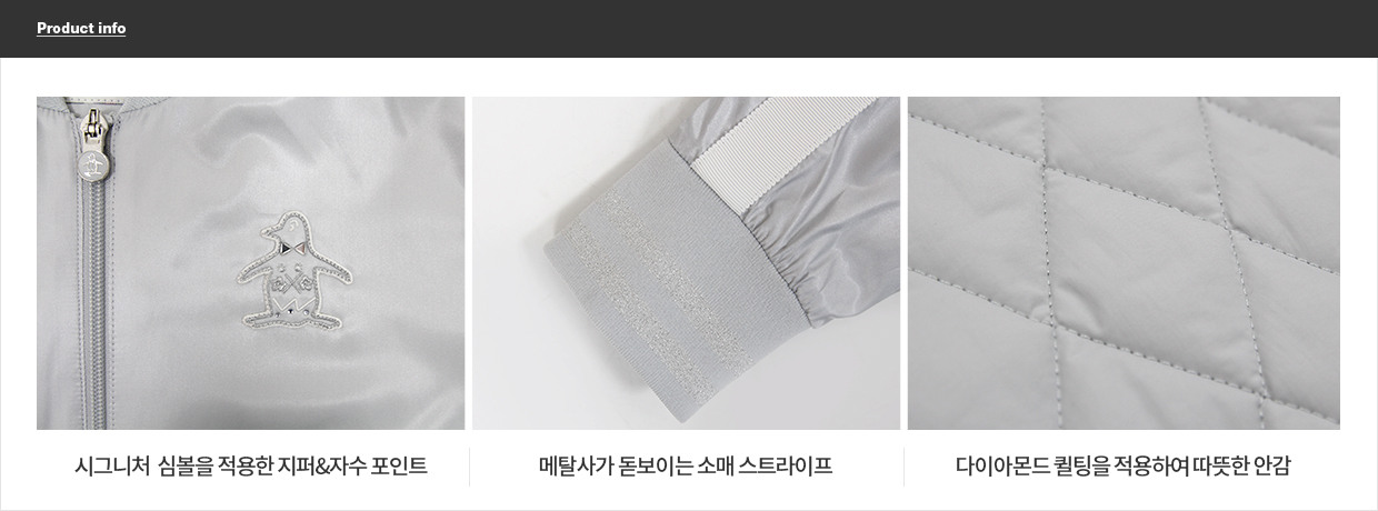 | 소재 | 겉감:폴리에스터86%나일론14% 배색:폴리에스터95%폴리우레탄5% 안감1:나일론100% 안감2:폴리에스터100% 충전재:폴리에스터100% |