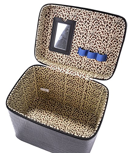 -. Feature : Coofit Brand Product: Material updated to good quality PU leather, So the outside feels its nice and sleek, easy to clean and matches everything. / Dimensions: (L*W*H): 9.4 x 7.0 x 8.2 inches (W x H x D) Because of the different measuring way, small size error is allowed. / This product comes in a couple of different colors. Colors are all so pretty and so is the inside leopard print. Top flap closes with 2 zippers, Inside you will be surprised to find 3 elastics to hold brushes or mascaras, a mirror. The handle makes it easy to carry anywhere you may need to go. / This is a nice large case to hold just about anything. Its made for makeup but its large enough to hold bigger bathroom supplies like perfumes and body washes. / The outside of the case has an ultra smooth feel with a crocodile pattern. The handle and box seem to be made very well and is a very durable case. This case is big capacity, waterproof and protect against scratches . It can makes the dressing table clean and tidy.