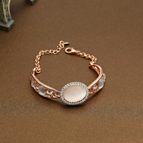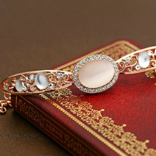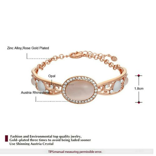 - Feature : The oval opal accents exuding a soft sheen and Austrian crystals are around it with a shinning gloss. / Three layers of 18K rose gold plated, polished finish and tarnish free. / The circumference of the bracelet is about 9''. It's a perfect accessory to your outfit or as an appropriate gift used in wedding and engagement party or other occasions. / Shipped out in an exquisite jewelry gift box. Delivery time 7-15 days. / One year warranty to ensure you a perfect shopping experience.