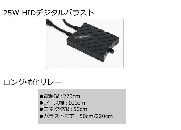 ガス抜けを防ぐ曇りガラス仕様のHIDバーナー、放熱性・安定性に特化したデジタルバラスト、強化リレーなどがセットになっています。