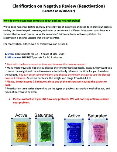 Packets can be Reactivated by Placing in the Oven for 0.5-2.0 hours at 200-250F Or Microwave for About 7-12 Minutes at DEFROST. Start with the least amount of time and increase the time if color is not fully returned to the original state or steam is visible inside the packet. Depending on beads' condition and types of microwave, they may take shorter than the recommended time. Please check the beads' color periodically.