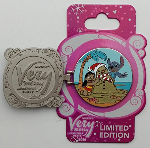 - The open pin has Stitch and Lilo on a beach making a "sand"man/snowman who is wearing a Santa hat and red and white striped scarf