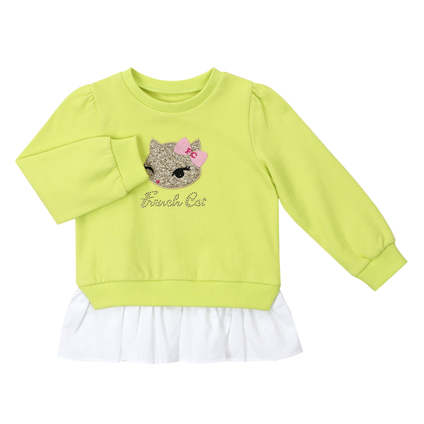 산듯한 연두 컬러와 화이트 면 프릴이 믹스된 배색 롱 맨투맨 입니다. 편안한 다이마루 소재로 만들어져 착용감이 편안합니다. 레이어드 된 듯한 화이트 면 프릴이 풍성한 셔링으로 러블리한 느낌을 줍니다. 골드 고양이 아플리케 포인트로 프랜치 캣 특유의 귀여운 느낌까지 부었습니다. 나염 레깅스나 사선 제깅스, 데님팬츠와 코디하시기 좋습니다