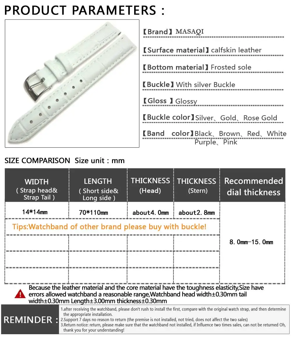 [해외]Masaqi 여성 시계 밴드 tissot 1853 t033410 정품 가죽 14 미리메터 시계 스트랩 높은 품질의 가죽 시계 줄