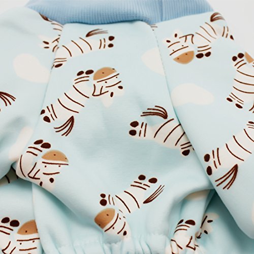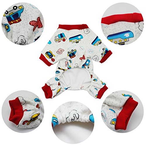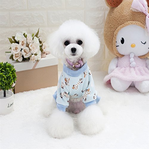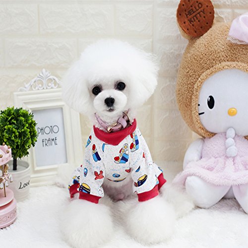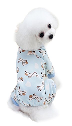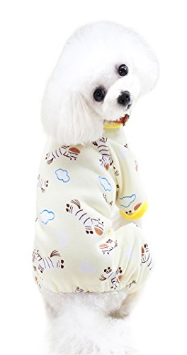 -. Feature : Size S: Back length:7.87 inch, Neck girth:9.05 inch, Chest girth:12.59 inch / Suitable for small sized dogs, such as Chihuahua, Poodle, Cup Poodle, Pomeranian, Yorshire Terrier, Bichon Frise, Cocker Spaniel and so on. / Awesome cute & warm: The pet jammies adopt adorable cartoon pattern for added vitality. Also, the thick pajamas will keep your puppies comfortable and warm during cool nights in winter. / Four legged design with elastic waist: The four legged jumpsuit considerately make sure to keep pets hindquarters warm as well, especially in cold autumn and winter seasons. Also, spring and autumn seasons are regular molt periods for most pet dogs. To avoid your swarmed with pet fur, a real headache for all families, four legged jumpsuit is a wise choice! / TIPS: Your baby usually wears size S doesn't mean all size S will fit him/her!!! So please measure your dog and have a reference before your purchase according to the size map below Product Description