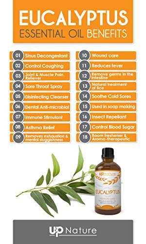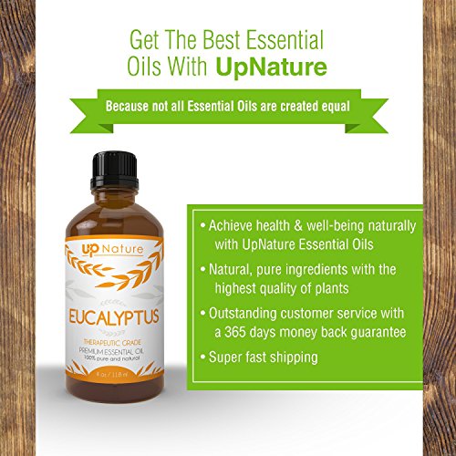 -. Feature : PREMIUM QUALITY EUCALYPTUS ESSENTIAL OIL: 100% Pure, Gentle and Effective Natural Eucalyptus Essential Oil. Without Any Toxins, No Additives, Unfiltered and Undiluted. Therapeutic Grade. Packaged in the USA. / YOU DESERVE THE BEST FROM UPNATURE - UpNature was founded by two brothers, with a vision to provide 100% all natural products, for easy, effective & natural solutions for health & well-being, so everybody can live happier and healthier lives. / 100% RISK FREE PURCHASE: Purchase with complete peace of mind, we are confident that our oils are by far the highest quality, we offer a full 100% 365 days money back guarantee. If you are not completely satisfied with Up Nature Eucalyptus Oil, we will refund your entire purchase. / POTENT ANTISEPTIC AND ANTIFUNGAL QUALITIES : Eucalyptus Essential Oil is known to be extremely effective against the common cold, coughs, and for remedying sinus issues, as it eases mucus, thereby clearing the head of any "stuffiness". Eucalyptus oil is so versatile that it is not only antifungal and antibacterial for your body, but for your home as well! A natural deodorizer, eucalyptus oil can kill household germs without the dangers of harmful chemicals. / NATURAL MOOD ENHANCING, REFRESHING AND ENERGIZING FEELING WITH EVERY BREATH YOU TAKE. It's the best healing alternative to common medicines and in most cases it works faster while having the double effect of preventing the common colds in the first place.