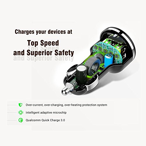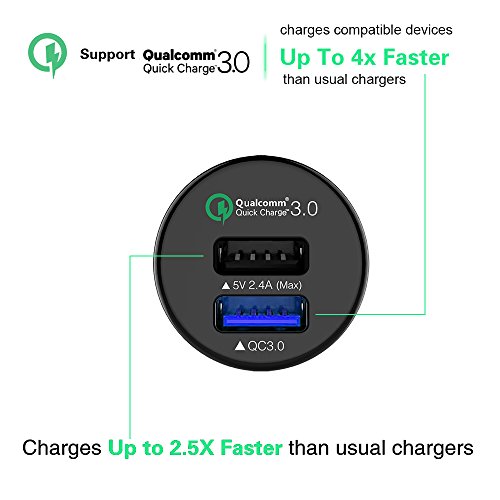 - Dual outputs & Supreme compatibility : Dual Quick Charge 3.0 and 2.4A smart USB ports- quickly and easily identify your mobile devices, to provide optimal charging efficiency automatically, simultaneously charging any two devices at high speed. Compatible with all USB powered devices including Quick Charge 1.0, 2.0 and 3.0, ensuring that even non-Quick Charge devices get the fastest charge possible, such as iPhone, iPad, smartphones and tablets.