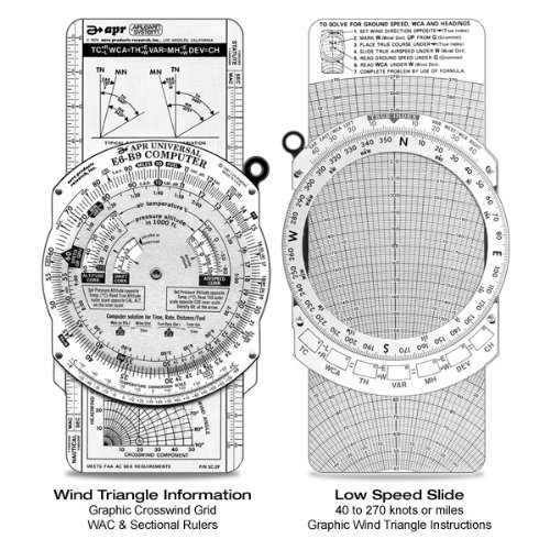 -. Feature : Classic Universal E6B. Wind Triangle Information and Low (40 to 270 kts or mi) Speed Slide / Miles and Gallons Scale (Distance), Off-course & Drift Corrections, Minutes & Hours Scale (Time) / Mach Number Index Window, Slide-Rule Mathematics, Wind Component Grid / Complete Instruction Manual includes Section on Dead Reckoning and Wind Effect Theory Calculation / Flush T/S/D Dial, Altitude Correction, Fuel Consumption, Density Altitude Factors