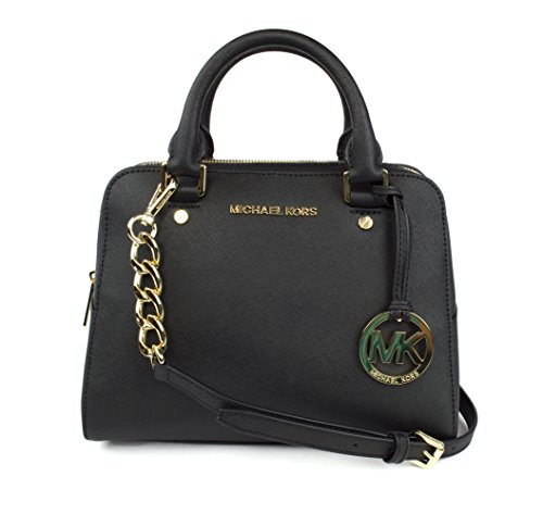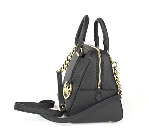 -. Feature : Leather / Interior: 1 side-zip pocket, 2 side-slip pockets / Exterior: top-zip closure, gold-toned hardware, MK charm / 6" x 8.5" x 6"; Drop strap: top handle: 3". Removable drop strap: 22" / Dust bag included