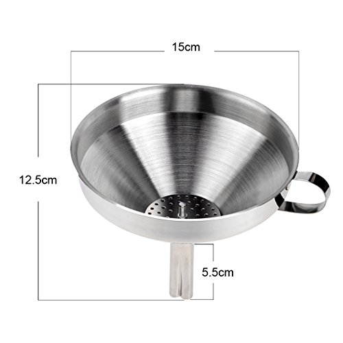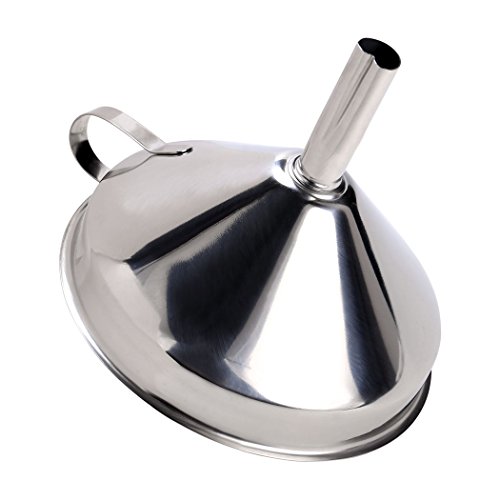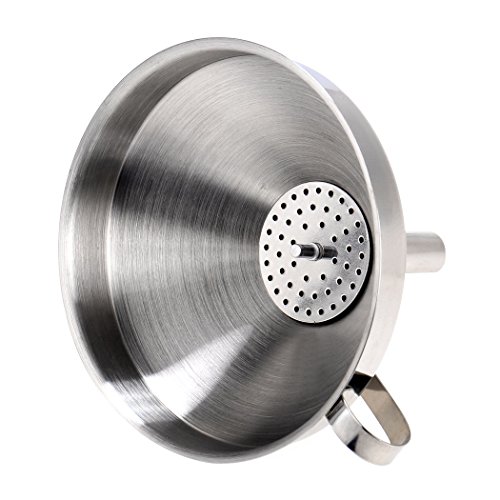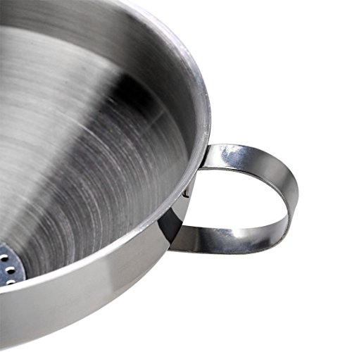 -. Feature : Made Of: Stainless Steel / Includes: Handle, Removable Strainer / Perfect for transporting liquids quickly & accurately, rebottling, adding ingredients, jams & marmalades to storage containers; has a side handle to conveniently hold the funnel over a jar, pot or pan / Easy to store in kitchen cabinets; easy to clean by simply washing with soapy water after use / Detachable Strainer So Solids Can Be Filtered From Liquids