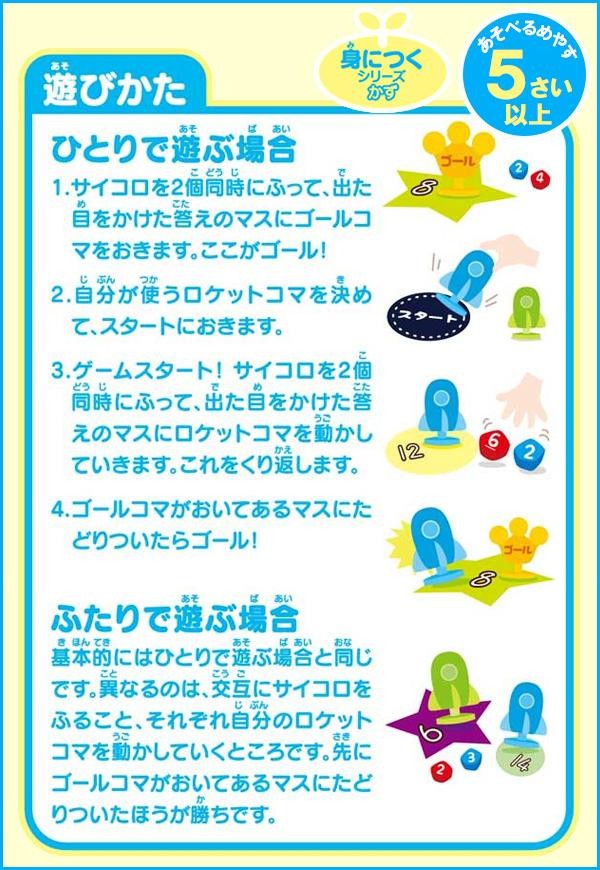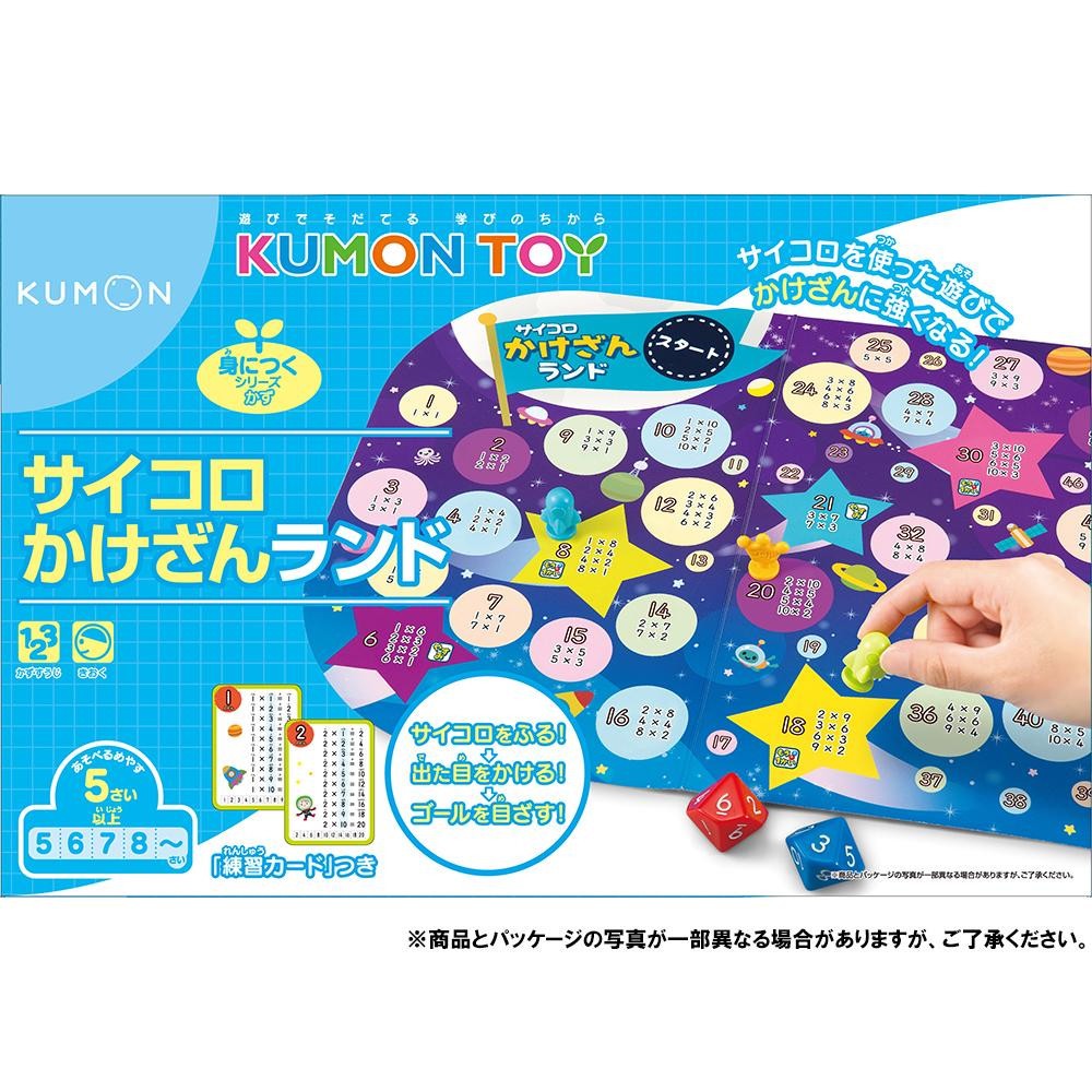 10面体のサイコロ2個を使って「出た目をかける」ことをくり返し、計算の基本となる九九の計算と10×10までを練習します。ひとりでもふたりでも遊べ、ついつい夢中になってくり返し練習することができます。これからかけざんに取り組むお子さまは、まずはボードの裏にある「かずのひょう」を使って数唱をします。しっかりと数の並びを身につけておくことで、無理なくかけざんに取り組むことができるようになります。 |