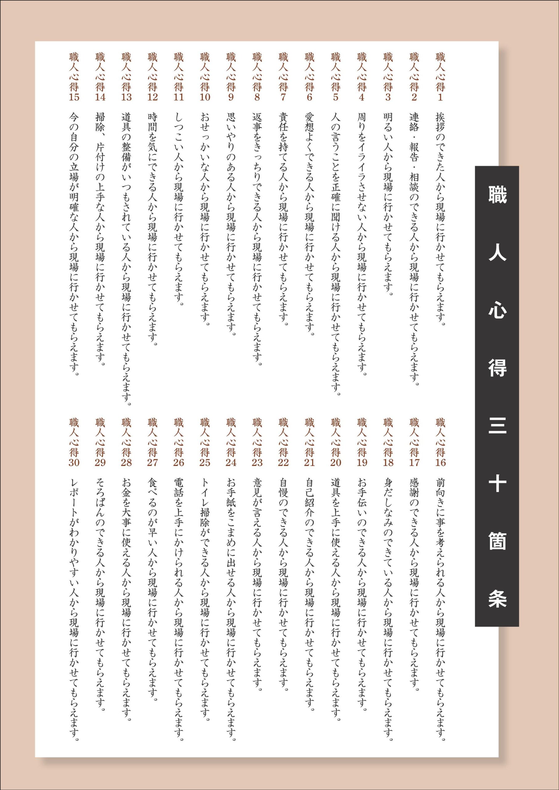 Akiyama Woodworker's "Thirty Items of Craftsmanship" is a preface to the attitude as a craftsman.