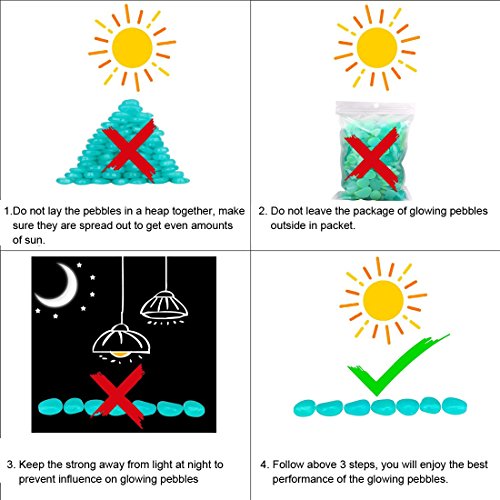 - ★Glow in the Dark Garden Pebbles absorb sunlight during the day and light up at night, and they will glows for up to 2-3 hours after normal daylight exposure.