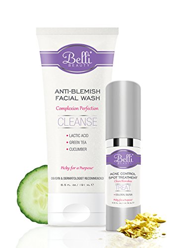 -. Feature : EXPECT BEAUTIFUL SKIN: Belli Anti-Blemish Basics provides 2 powerful blemish fighting products. Our Anti-Blemish Facial Wash and Acne Control Spot Treatment are designed to help maintain a beautiful, healthy complexion. It is a favorite of those strling with pregnancy acne, adult acne, sensitive skin, or breakouts from hormonal changes. / INCLUDES FACE WASH AND SPOT TREATMENT - This dynamic duo includes our Anti-Blemish Facial Wash (6.5 oz.), which uses a blend of lactic acid, green tea, and cucumber extract to gently exfoliate skin without over-drying or irritation. It also includes our Acne Control Spot Treatment (0.5 oz.) with colloidal sulfur to clear acne blemishes and help prevent new breakouts. / ENJOY PEACE OF MIND: Belli is Picky for a Purpose to give you peace of mind. Every Belli product is allergy tested, free of paraben preservatives, gluten, phthalates, and artificial dyes or fragrances. For expecting and nursing moms, Belli even follows a unique safety screening process to avoid ingredients, synthetic or natural, with known links to birth defects or harmful effects while breastfeeding. Belli's pregnancy skincare products are loved by moms before, during and after pregnancy. / APPLICATION INSTRUCTIONS: Gently apply our Anti-Blemish Facial Wash onto a damp face or body, massage into skin for 30-60 seconds. Rinse and pat dry. Use two times a day, morning and night. After cleansing, apply Acne Control Spot Treatment to affected area with a thin layer one to three (maximum) times daily. / PRODUCT SPECIFICATIONS: Package includes (1) 6.5 oz. Belli Anti-Blemish Facial Wash and (1) 0.5 oz. Belli Acne Control Spot Treatment.