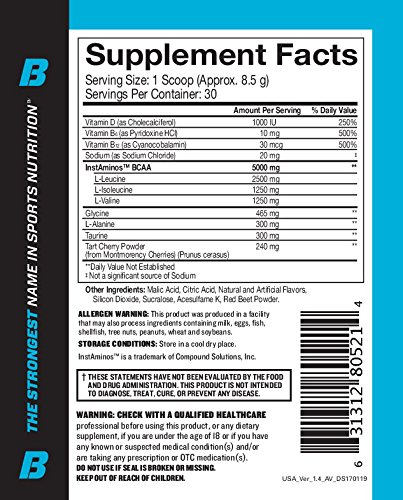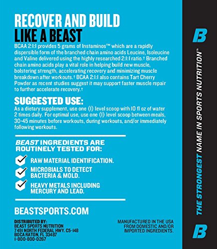 "Unleash your inner beast by adding the Beast BCAA 2:1:1 amino acid dietary supplement to your Amazon shopping cart. Made with InstAminos for rapid dispersion, our blend of building block amino acids is formulated at the perfect and clinically-studied ratio of 2:1:1 of leucine, isoleucine, and valine. We’ve also included tart cherry extract, a cutting edge ingredient to aids in rapid muscle recovery and supports connective tissue. Beast BCAA 2:1:1 helps to promote new muscle growth, improve recovery time, and reduce the muscle tissue breakdown that is common during workouts and while dieting. Our BCAA 2:1:1 ratio works exceptionally well with other Beast Sports Nutrition products and is intended for anyone who is serious about getting big, being strong, keeping fit, and staying healthy.