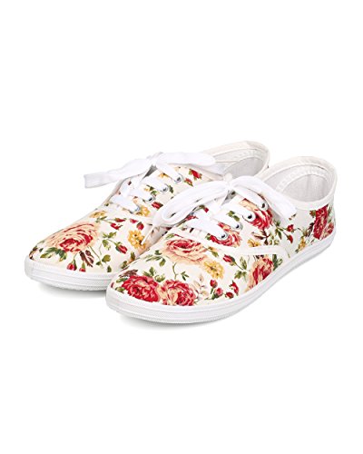 Product Description Designed with canvas upper, floral pattern, lace up front, flat heel, stitch accents, trimmed borders, and easy to pull on design. 0