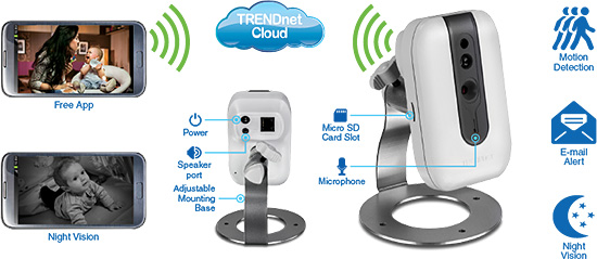 The Wireless HD Day/Night Cloud Camera, model TV-IP762IC, takes the work out of viewing HD video over the internet. After a brief installation, simply open a web browser and login from any internet connection to view and manage this camera. The free TRENDnet CloudView App brings live video to Apple® and Android™ mobile devices. Night vision provides surveillance in complete darkness.