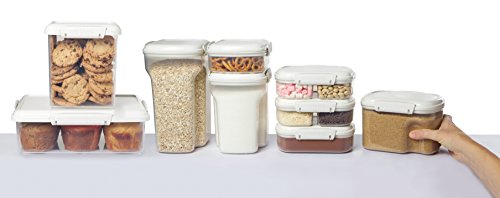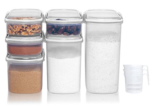Space saving compact stackable storage system; sized for bulk baking products; meausuring cup for scooping and pouring