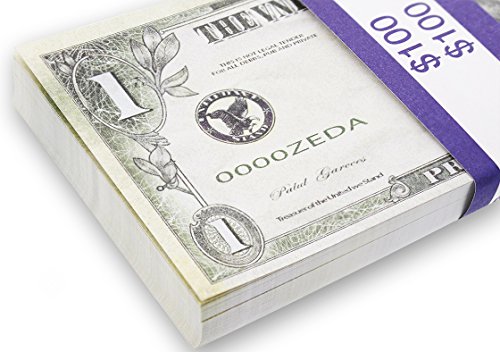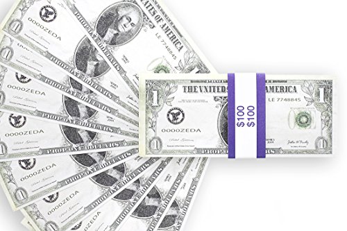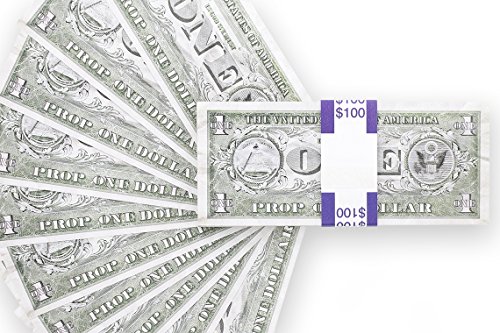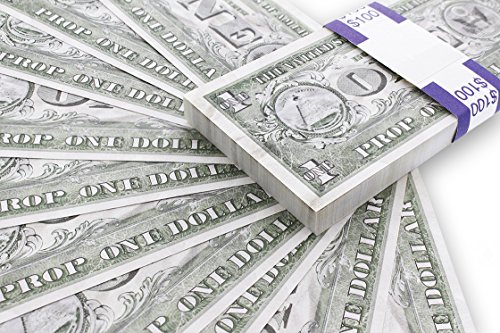 Fake Money Stack - Realistic Full Print Prop Money - Set of 100 Novelty $1 Dollar Bills Total $100 with Blue Currency Strap - For Movies, Music Videos, TV, Advertising, & Pranks, 6.25 x 2.5 Inches