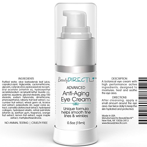 -. Binding : Misc. -. Brand : BeautyDirectli -. EAN : 0820103102407 -. Feature : The Best Eye Cream for Wrinkles, an Eye Cream men will want, and one of the Best Anti Aging Creams, A Must Have Skin Care Product for Men and Women. This hydrating eye cream helps to reduce the appearance of fine lines and wrinkles. No need to share your partner's eye cream - Order 2 today! / One of the best eye creams, specifically formulated for the eye area will be milder and less irritating than a typical moisturizer. This botanical eye cream with high performance active ingredients is designed to moisturize, treat and soothe the eye area. / Use twice daily, morning and evening for best results. Can be worn under makeup. 0.5oz is expected to last 45-60 days, because less than half the size of a pea is enough for one treatment without over saturating. Since the lower eyelid skin is thin, it can easily become irritated if active ingredients are over applied. DO NOT OVER APPLY - Over saturation can cause irritation. / Made in USA at an FDA Certified Lab with Good Manufacturing Practices (GMP). No animal testing - cruelty free. / 100% SATISFACTION GUARANTEED - If you're not happy with the results, just let us know and we'll refund 100% of your purchase price - NO questions asked! ***Start Turning Back the Clock Today! ORDER NOW!! *** -. Label : Global Beauty -. Manufacturer : Global Beauty -. Model : CX618S -. MPN : CX618S -. NumberOfItems : 55 -. PartNumber : CX618S -. ProductGroup : Beauty -. ProductTypeName : BEAUTY -. Publisher : Global Beauty -. Studio : Global Beauty -. Title : BeautyDirectli Eye Cream for Wrinkles - BEST Anti Aging Eye Cream for Fine Lines -. UPC : 820103102407