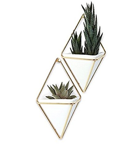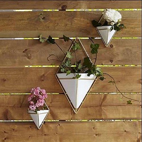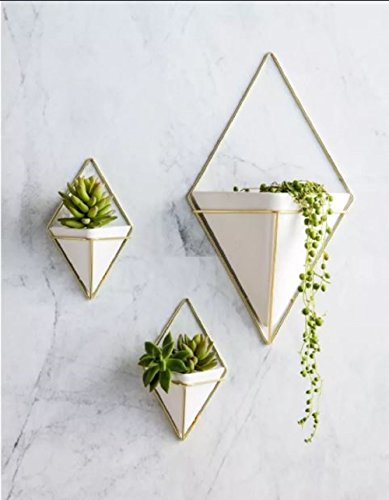 Trigg Hanging Planter Vase & Geometric Wall Decor Container, SET OF 3 White Ceramic/Brass (1 Large + 2 Small )
