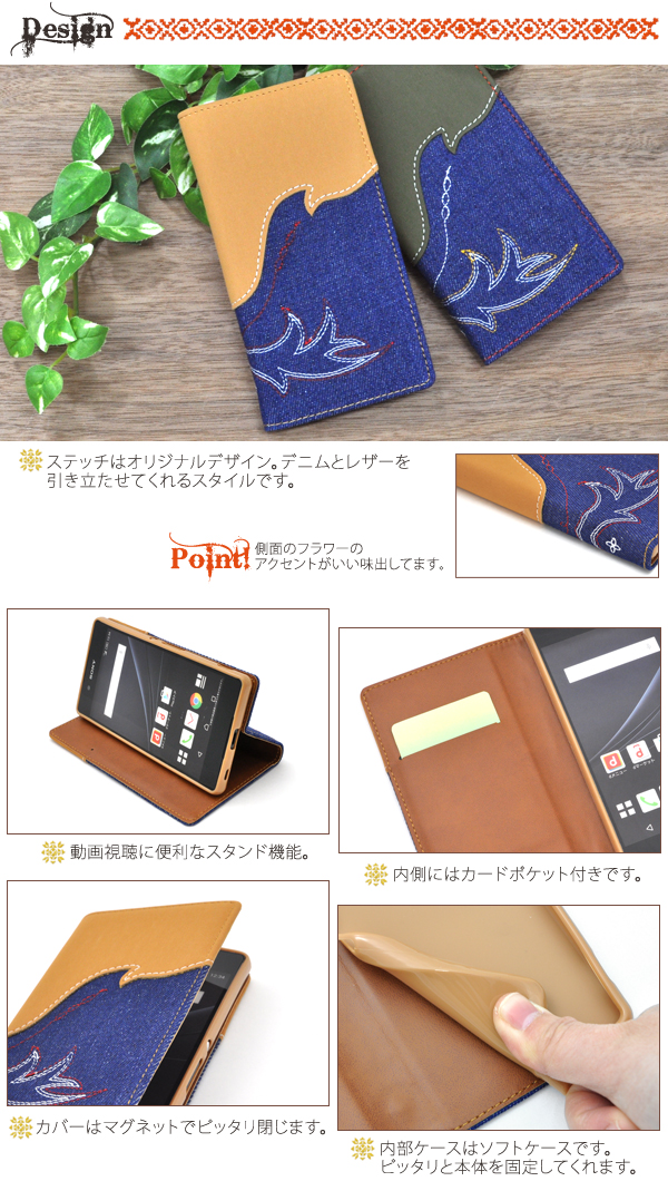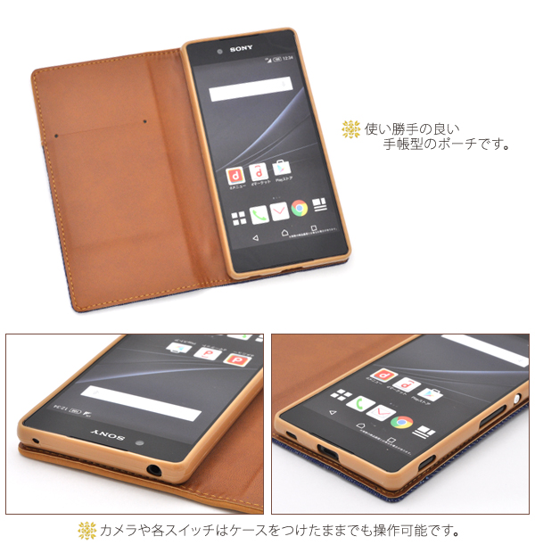 | 製品仕様 | | 対応機種 | Xperia Z4(SO-03G/SOV31/402SO) | | 素材 | 合皮、TPU、デニム | | 注意事項 | ※本製品はマグネットを使用しておりますのでクレジットカードなどの磁気カードの収納は避け、 カードの注意事項をよくご確認の上ご使用ください。 読み取り等ができなくなる恐れがあります。 ※本製品に収納された、カードのデータ等が喪失された場合におきましても、当社では一切保証致しかねます。 ※長時間接触していたり、強い力で擦れるとスマートフォンに色移りする場合がございます。 ※本製品をスマートフォンに装着する際には本体や本製品に付着したゴミやホコリをよく取り除いてください。ホコリ等がついたまま装着すると、スマートフォンに傷がつく恐れがあります。 ※本製品は強い衝撃からスマートフォンを保護することは出来ません。 |