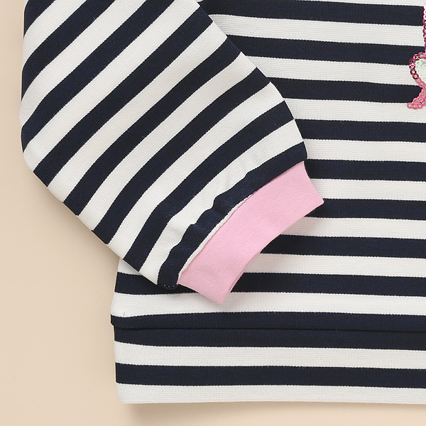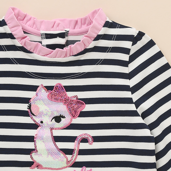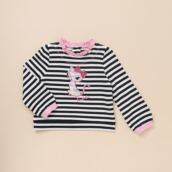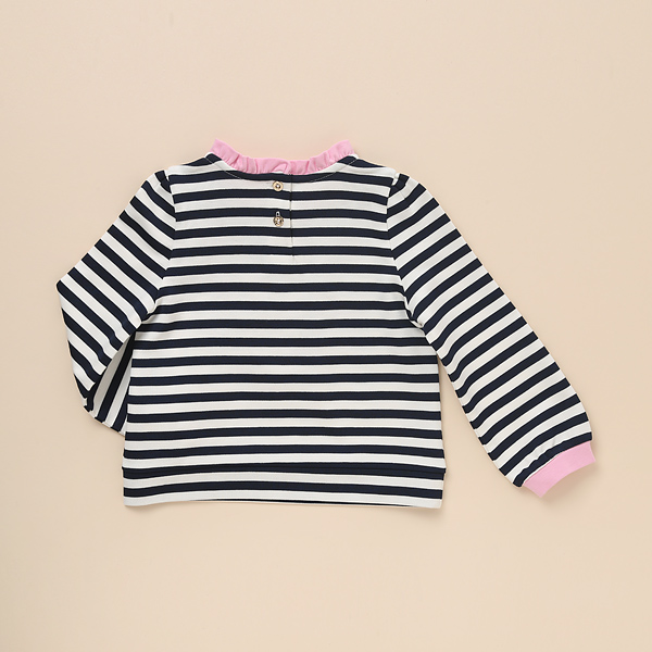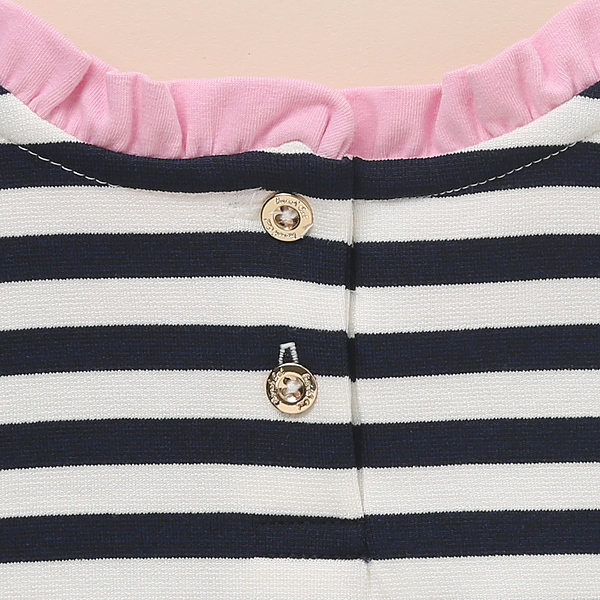 상품설명 네이비와 화이트가 믹스된 스트라이프 프릴 탑입니다. 목 프릴에 핑크 배색이 들어가 러블리한 느낌을 더해줍니다. 블링한 고양이 스팽글 포인트로 큐티한 느낌까지 주었습니다. 네이비 스칼럽 점프 스커트나 네이비 스칼럽 스커트와 코디하시는 것을 추천드립니다.