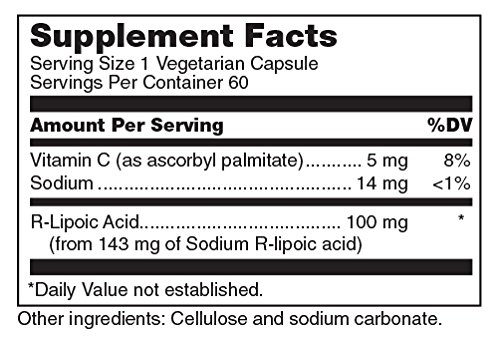 R-Lipoic Acid capsules contain 100 mg of pure R-lipoic acid. The R-lipoic acid isomer used in this formulation is provided in a stabilized form as Sodium-R-lipoate to provide increased bioavailability compared to R,Slipoate.Feature