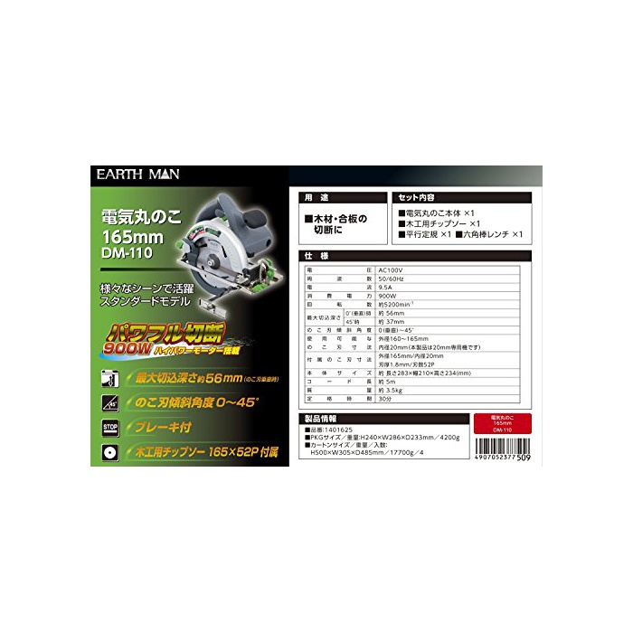 원본상품명:高儀 EARTH MAN 電丸のこ 165mm DM-110