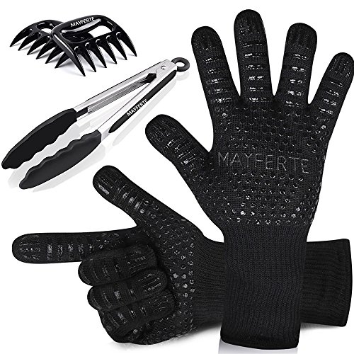 MAYFERTE BBQ Cooking Gloves Heat Resistant Glove Meat Claws & Stainless Steel Cooking Tongs