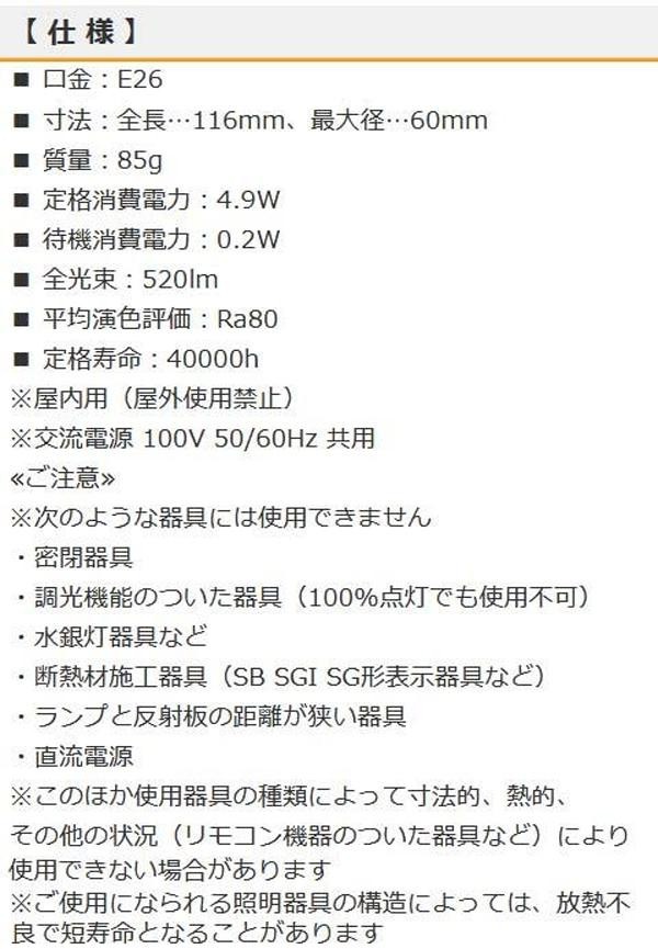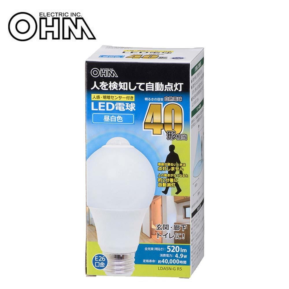 | 白熱電球40形相当のLED電球です。周囲が暗いとき人が近付くと自動点灯、離れると120秒後に自動消灯します。光色は昼白色で屋内専用です。内玄関・廊下・階段・トイレにおすすめです。 |