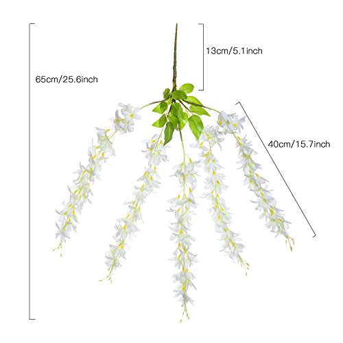 - Each flower bush has 5 stems w/a lot of small blooming flowers, silk leaves and fake thorns;Each flower stem long 16",the whole bush long 26",package include 2x rtificial wisteria long hanging flower bush.