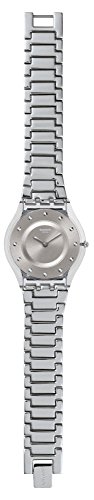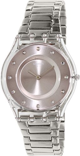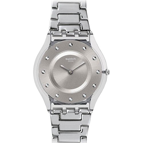 Studio : Swatch Publisher : Swatch Binding : Watch Product Description Translucent plastic case with a stainless steel bracelet. Fixed translucent bezel. Silver dial with silver-tone hands and dot hour markers. Dial Type: Analog. Quartz movement. Scratch resistant sapphire crystal. Pull / push crown. Solid case back. Case dimensions: 34 mm x 38 mm. Case thickness: 4 mm. Round case shape. Band width: 20 mm. Jewelry clasp. Water resistant at 30 meters / 100 feet. Functions: hour, minute. Casual watch style. Swatch Drawer Silver Dial Stainless Steel Ladies Watch SFK393G. 0