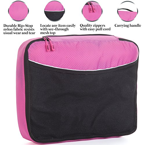 PROTECT YOUR CLOTHES AND LUGGAGE from stains, wrinkles and damages while traveling; the cubes are made of durable rip-stop honeycomb Nylon fabrics that tucks your clothes safely inside.