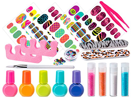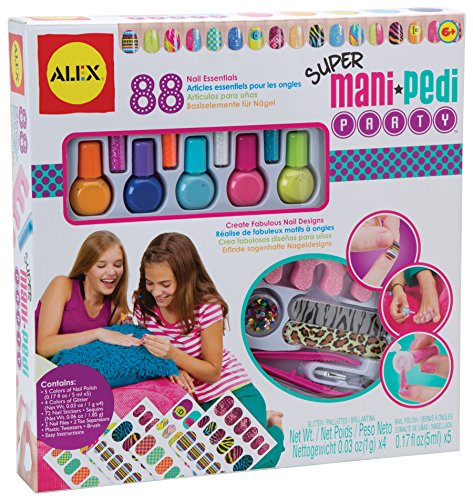-. Feature : 88 nail essentials / Create Fabulous Nail Designs / Enough for a whole party / Includes 5 shades of nail polish, 4 colors of glitter, 72 appliques, sequins, nail files, toe separators, tweezers, brush and instructions / Recommended for children 6 years of age and older