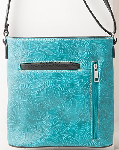 Made from high quality premium PU faux/imitation turquoise leather with textured designs all around purse, large silvertone rhinestone cross, embroidered cut out wings, silvertone studs, rhinestones, and decorative stitching on the front