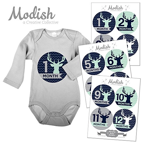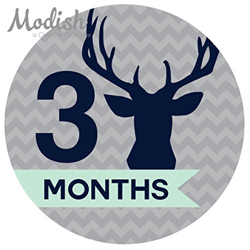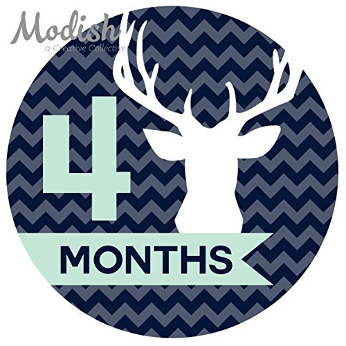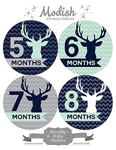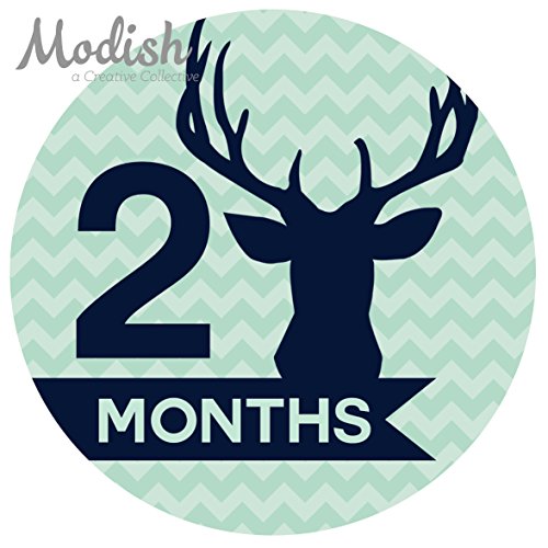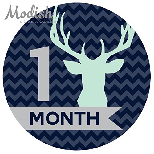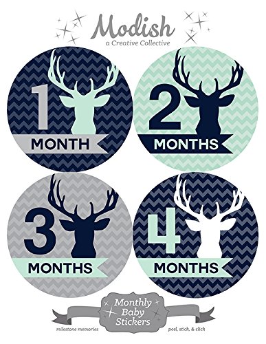 12 Monthly Baby Stickers, Boy, Deer, Antlers, Baby Belly Stickers, Baby Month Stickers, First Year Stickers Months 1-12, Chevron, Blue, Navy, Navy Blue, Mint,...