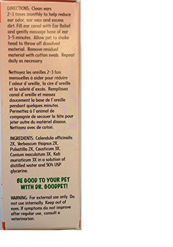 -. Binding : Misc. -. Brand : Dr. Goodpet -. Department : Pet Care -. EAN : 0031697101077 -. Feature : Helps keep ear canals clean for cats and dogs / Reduces ear odor, earwax and excess dirt / Coats and protects inside of ears, antifungal and antibacterial / Especially useful for long-eared breeds / Kills mites and helps keep ears clean and healthy without drugs -. IsAdultProduct : 0 -. Label : Very Healthy EnterP.R.Ises Inc -. Manufacturer : Very Healthy EnterP.R.Ises Inc -. Model : ER107 -. MPN : ER107 -. PackageQuantity : 1 -. PartNumber : ER107 -. ProductGroup : Pet Products -. ProductTypeName : PET_SUPPLIES -. Publisher : Very Healthy EnterP.R.Ises Inc -. Size : Small -. Studio : Very Healthy EnterP.R.Ises Inc -. Title : Dr. Goodpet Homeopathic Ear Health Formula for Dogs & Cats, Small -. UPC : 031697101077