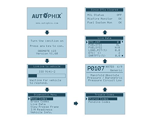 - LARGE DISPLAY: the automotive scanner is well built with a large LCD display (128 x 64 pixel) that has white backlight and contrast adjustment, indicates test results directly. One year warranty. FCC CE Rohs certifications.