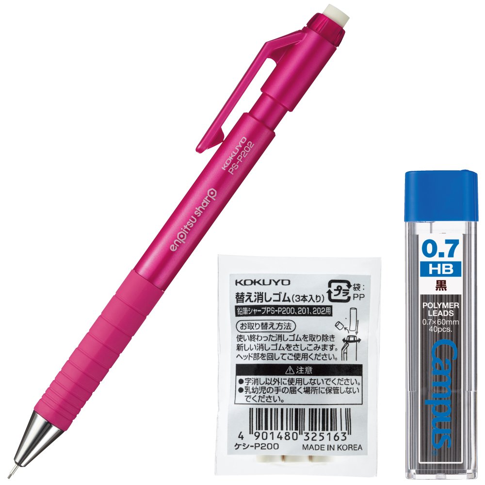 鉛筆シャープシリーズに、書き心地がさらによくなった鉛筆シャープTypeSが登場! 【カラー】 ピンク ※シャープペンシル本体にあらかじめHB芯が2本入っています。 【付属】 替芯(0.7mm・HB・40本入り)、替え消しゴム(φ7mm×23mm、3本入り) 【芯径】 0.7mm 【ペン寸法(軸径×長さ)】 φ10.5mm×143mm 【材質】 軸:PC、グリップ:TPE、クリップ:ABS 【芯先】 パイプスライド