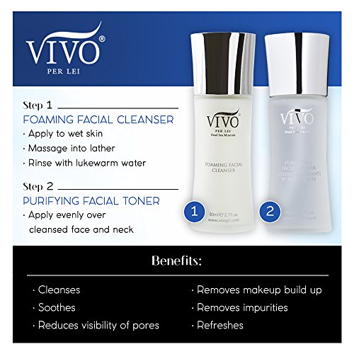 Wash away impurities, makeup residue and dirt from your facial skin with the Vivo Per Lei Foaming Facial Cleanser. Formulated using a blend of Dead Sea minerals and Witch Hazel extract, this foaming cleanser offers a refreshing cleanse without irritating or drying your skin. he Vivo Per Lei Purifying Facial Toner is designed to be used after using the Vivo Per Lei Foaming Cleanser or any facial cleanser of your choice. Infused with Hyaluronic Acid, Vitamin B3, Dead Sea minerals and nourishing Castor Oil, this toner will help balance the pH level of your skin and minimize the appearance of pores for a smoother, softer and dewy looking glow.Feature
