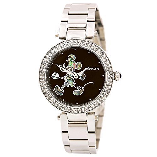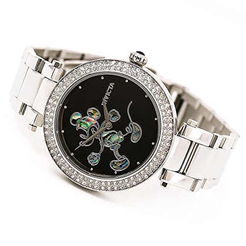 Invicta 23780 Disney Limited Edition women's watch features a 38mm wide and 13mm thick solid stainless steel case with 120 crystals accented bezel and textured push-pull crown. Invicta 23780 is powered by a precise Japanese TMI VJ20 quartz movement. This beautiful watch also features Mickey mouse abalone enamel sharp looking black dial with silver tone luminous hands and dot hour markers, scratch resistant flame fusion crystal and water resistant to 100 meters. Invicta 23780 is equipped with an 18mm wide solid stainless steel bracelet with a fold over push button clasp. Invicta 23780 women's Disney crystal bezel black dial stainless steel bracelet watch is brand new and comes in an original Invicta gift box and is backed by a 5 year limited warranty.Feature