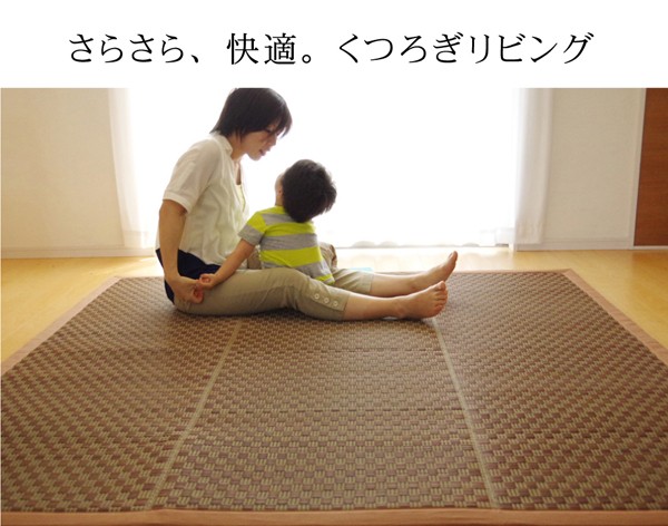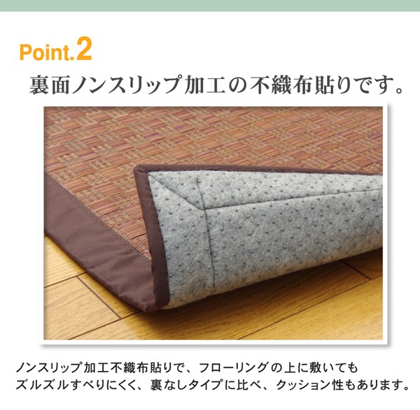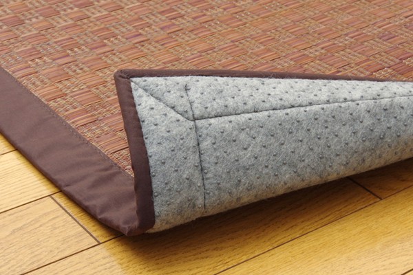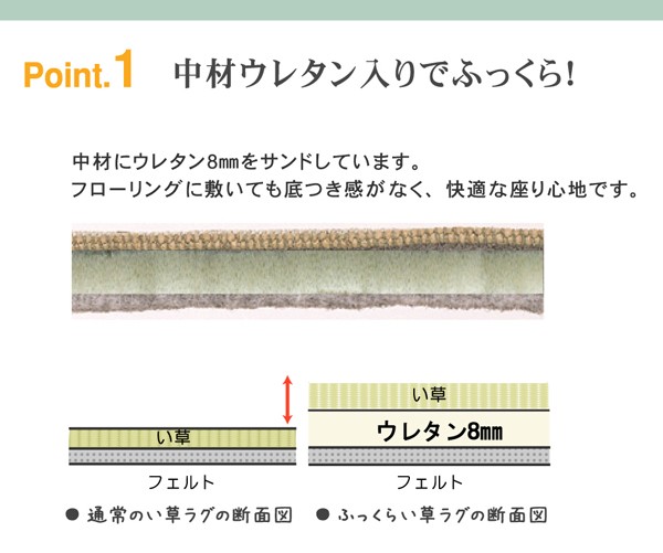 クッション性にこだわったイ草カーペットです。クッション性に優れたウレタンをイ草と不織布でサンドしました。フローリングのお部屋に最適な商品です。ボリュームがあるので床下への騒音を軽減する効果があります。い草には空気の自然浄化作用、湿度の調節作用などがあります。また汚れにくく、使用するうちに黄金色に変化し、味が出ます。ホットカーペットカバーとしても使用できます。い草に青森ヒバ加工を施しています。(抗菌、防臭効果)フローリングを傷付けにくい様裏面には不織布を貼っています。