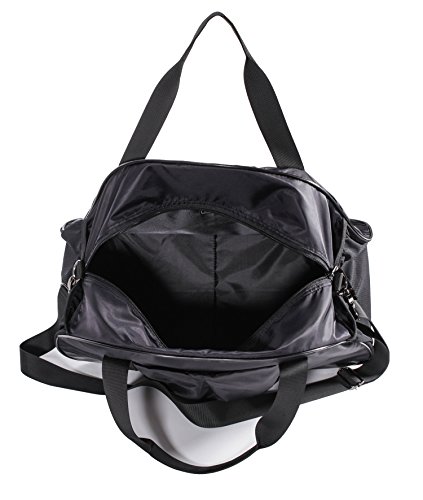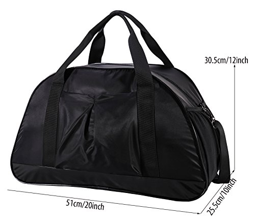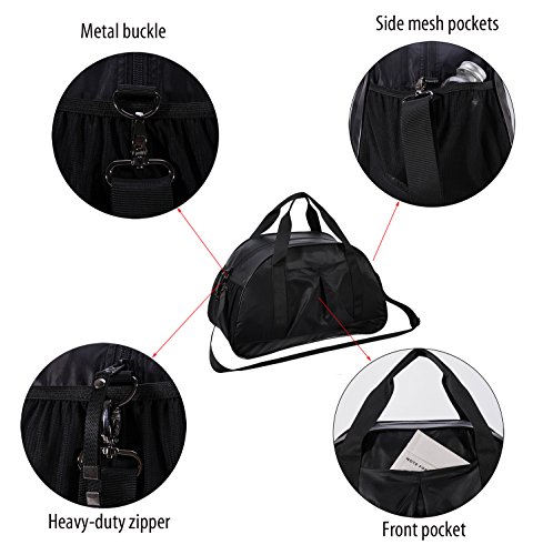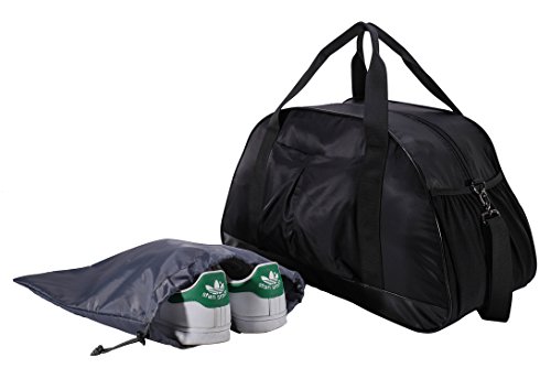 -. Feature : Removable laundry bag ---- MIER stylish gym bag comes with a Internal drawstring bag to separate shoes and sweaty gear from other stuff. Measuring 14.5" in length, can fit most size shoes / Multiple pockets Duffel-- The roomy main compartment with 2 net bags and 1 zipper pocket interior for organizing your valuables, exterior 1 easy-access front open pocket and 2 side elastic mesh pockets for water bottle or other extra storage / Lightweight and Durable ---- Made of rip-stop and water-resistant nylon with a solid padded bottom, ultra lightweight (only 1.1 lb). Use strong metal clasps and heavy-duty "MIER" logo zippers / Comfortable carrying ---- Detachable adjustable shoulder strap for comfort, adjusted from 31" to 60" and dual grab handles for easy carrying / Functional duffle bag ---- Sized 20"LX10"WX12"H, compact to fit most gym locks and within airline carry on allowance. Ideal to used as sports gym bag, travel tote bag, carry on bag and weekend bag. Perfect for teens or unisex adults