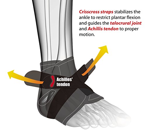 [Description] FIRM & RELIABLE support for acute injuries such as muscle strain_ ligament sprain_ or stabilizing weakened ankle joints following surgery ATHLETE FRIENDLY open-heel design enables broad a range of motion while bracing the plantar flexion_ talocrural joint_ and Achilles tendon; ideal for injury prevention during running_ or playing basketball_ football_ or soccer SIMPLE & EFFECTIVE high-grip crisscross Velcro straps attach anywhere along the entire sleeve to provide customized tightness and bracing to individual needs QUALITY NEOPRENE SLEEVE boosts localized blood circulation and provides soothing warmth_ accelerating the body``s natural recovery; perforations ensure breathability_ meaning it can be worn comfortably underneath socks against the skin throughout the day VERSATILE DESIGN fits either the left or right foot up to 11`` in arch circumference VERSATILE DESIGN fits either the left or right foot up to 10`` in arch circumference