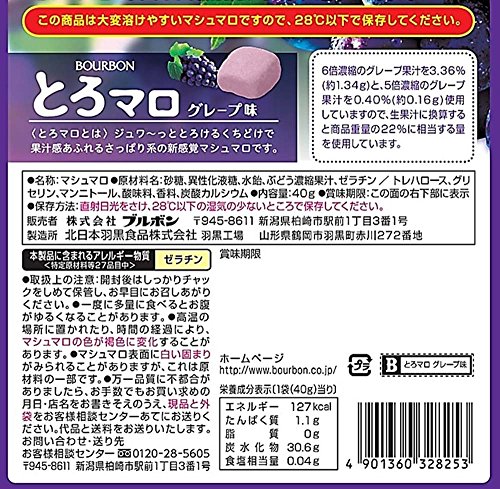 原材料:砂糖、異性化液糖、水飴、ぶどう濃縮果汁、ゼラチン /トレハロース、グリセリン、マンニトール、酸味料、香料、炭酸カルシウム